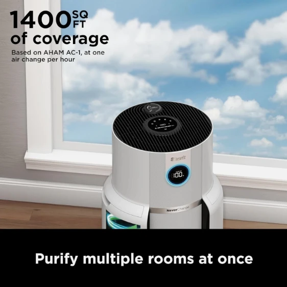 The Shark NeverChange Air Purifier MAX is designed for 10x longer filter life, saving you $300 or more in filter replacement costs over 5 years*. It captures 99.98% of airborne particles like allergens*, dust, and dander (based on IEST-RP-CC007.3, 0.1-0.2 microns). It covers up to 1400 sq. ft. for powerful, multi-room purification. Odor Neutralizer Technology guards against odors throughout your home, releasing a fresh scent into your air for 2x better odor reduction vs. filtration alone, Based on ASTM E544 vs. HP300 with filter and carbon only, after 30 minutes. *Allergen refers to non-living matter. *Vs. cost of replacing filters on a competitor unit over 5-year period in 300 square foot space.